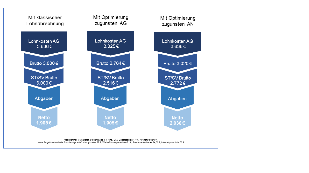 Unser Ansatz ist dabei, das vom Arbeitgeber gewünschte Bruttogehalt durch den Einsatz individuell abgestimmter Entgeltbausteine derart zu optimieren, dass es sich mit den Netto-Gehaltsvorstellungen des potentiellen Kandidaten deckt. Dies führt zu einer Win-Win-Situation, sowohl für den Arbeitgeber, der seinen Wunschkandidaten für sich gewinnt, als auch für den neuen Mitarbeiter, dessen finanzielle Vorstellungen erfüllt werden.