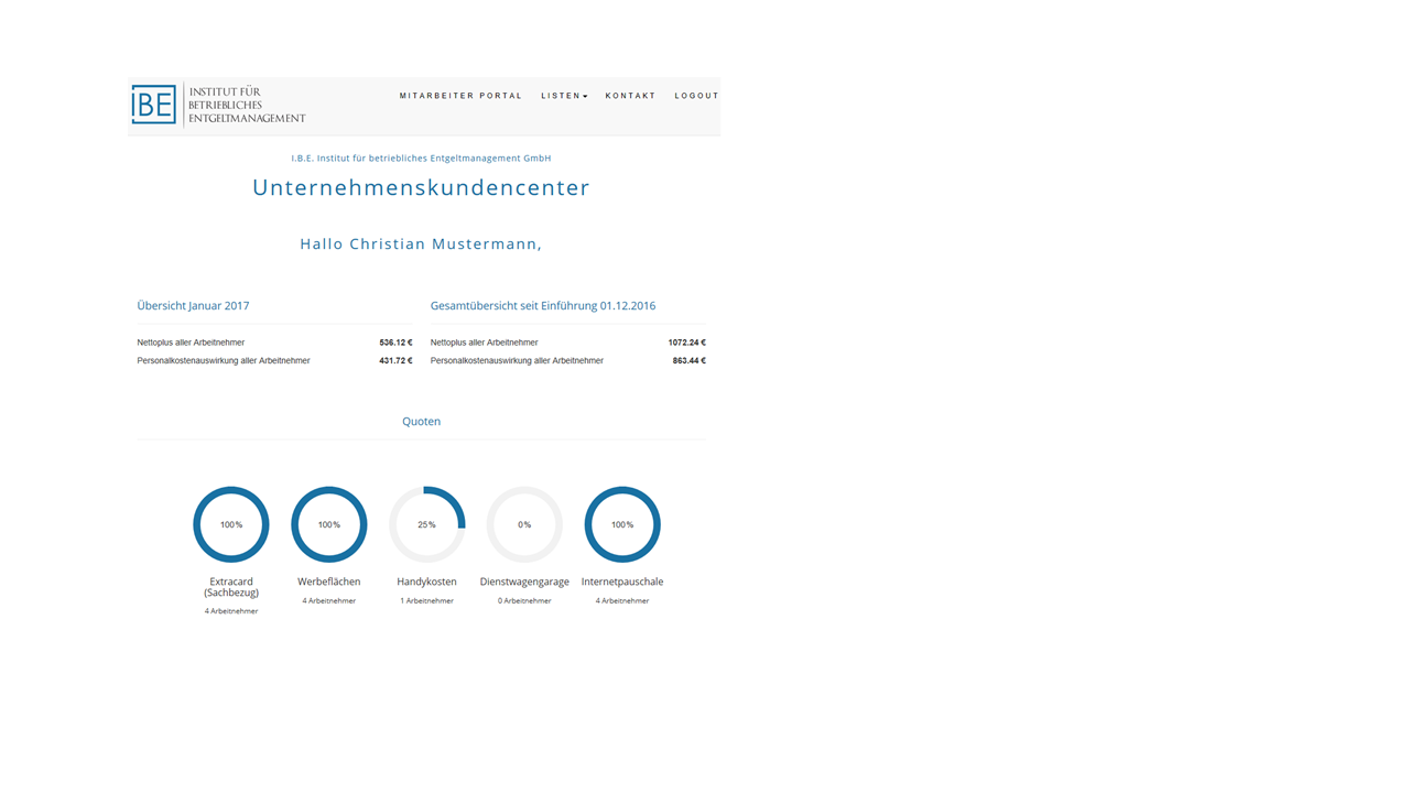 Wie beim Online-Banking gewinnen Sie hier einen schnellen und umfassenden Überblick über Ihr komplettes Entgeltmanagement: Im gesicherten Bereich des Unternehmenskundencenters finden Sie alle mit den Arbeitnehmern zur Entgeltgestaltung ausgefertigten Vertragsunterlagen, die individuellen Arbeitnehmerdaten zur Nutzung von Vergütungsbausteinen innerhalb des betrieblichen Entgeltmanagements und die systemrelevanten Rechnungen. Das Kundencenter bietet zusätzlich die Möglichkeit direkt unterschiedlichste Prozesse zu Geschäftsvorfällen anzustoßen und gezielte Informationen abzurufen.