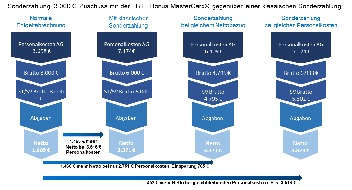 I.B.E. hat mit der MasterCard eine eigene I.B.E. MasterCard® auf den Markt gebracht, die die Nutzung dieser Regelung vereinfacht. Im Rahmen unseres Vergütungsbausteins § 37 b können Arbeitgeber steuerbegünstigte Zahlungen in beliebiger Einzelbetragshöhe bis maximal 10.000 € Gesamtbetrag p.a. auf die I.B.E. MasterCard® Ihrer Mitarbeiter veranlassen.